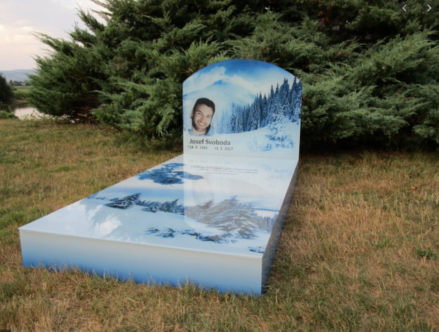 Světlá Mokrá Modř ve zmrzlém stádiu použita na náhrobním kameni. Ukázka, že tato barva je vhodná pro opravdu každé odvětví.